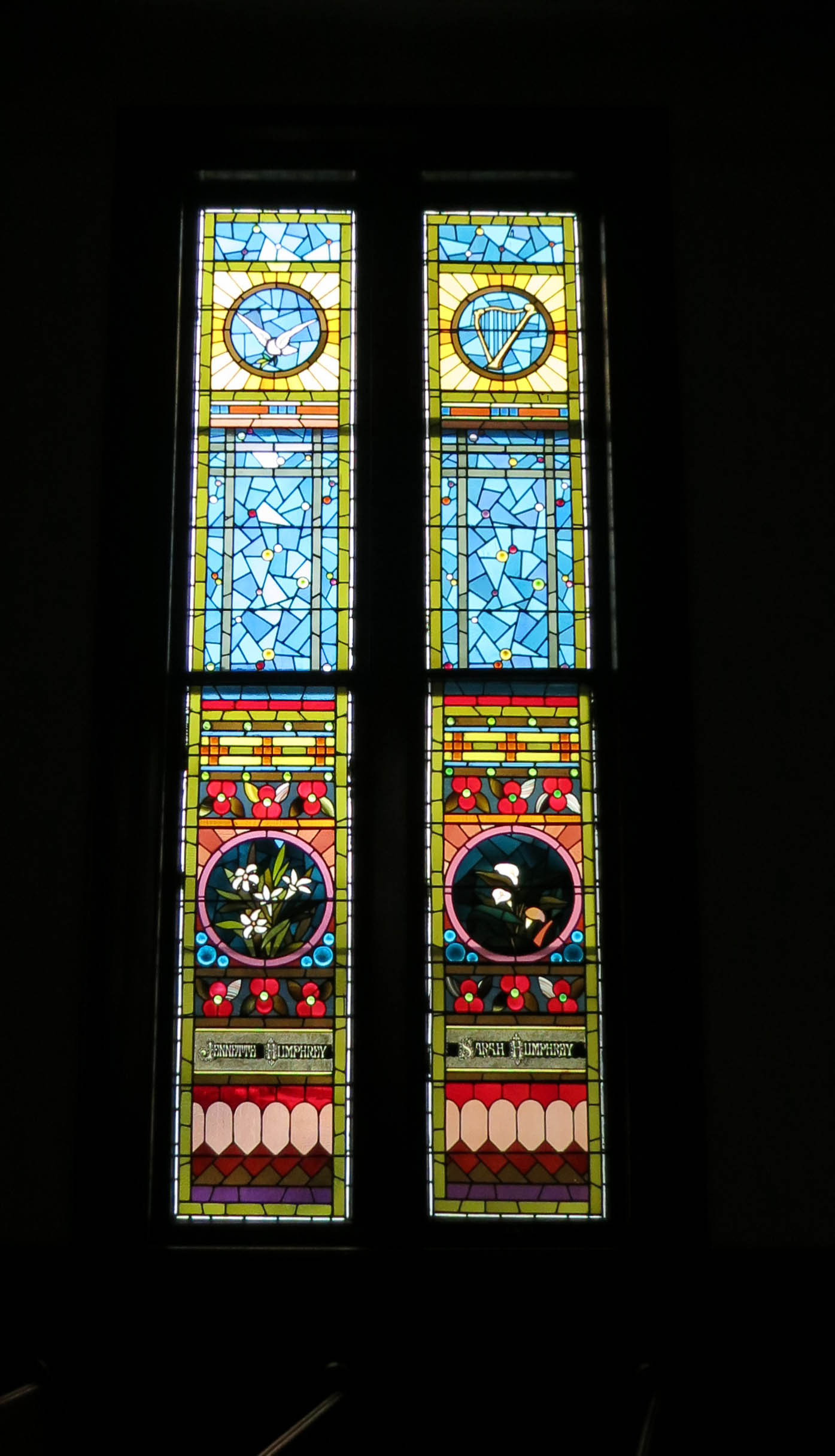 This stained glass window is dedicated to Jennette Humphrey and Sarah Humphrey, two sisters of the venerated Deacon John Humphrey. The window was presented by Mrs. James Calvin Taylor. Jennette and Sarah were devoted and quietly helpful members of First Parish Church. Jennette died in 1874 and Sarah died in 1866. The window includes symbols of a harp and a dove.
