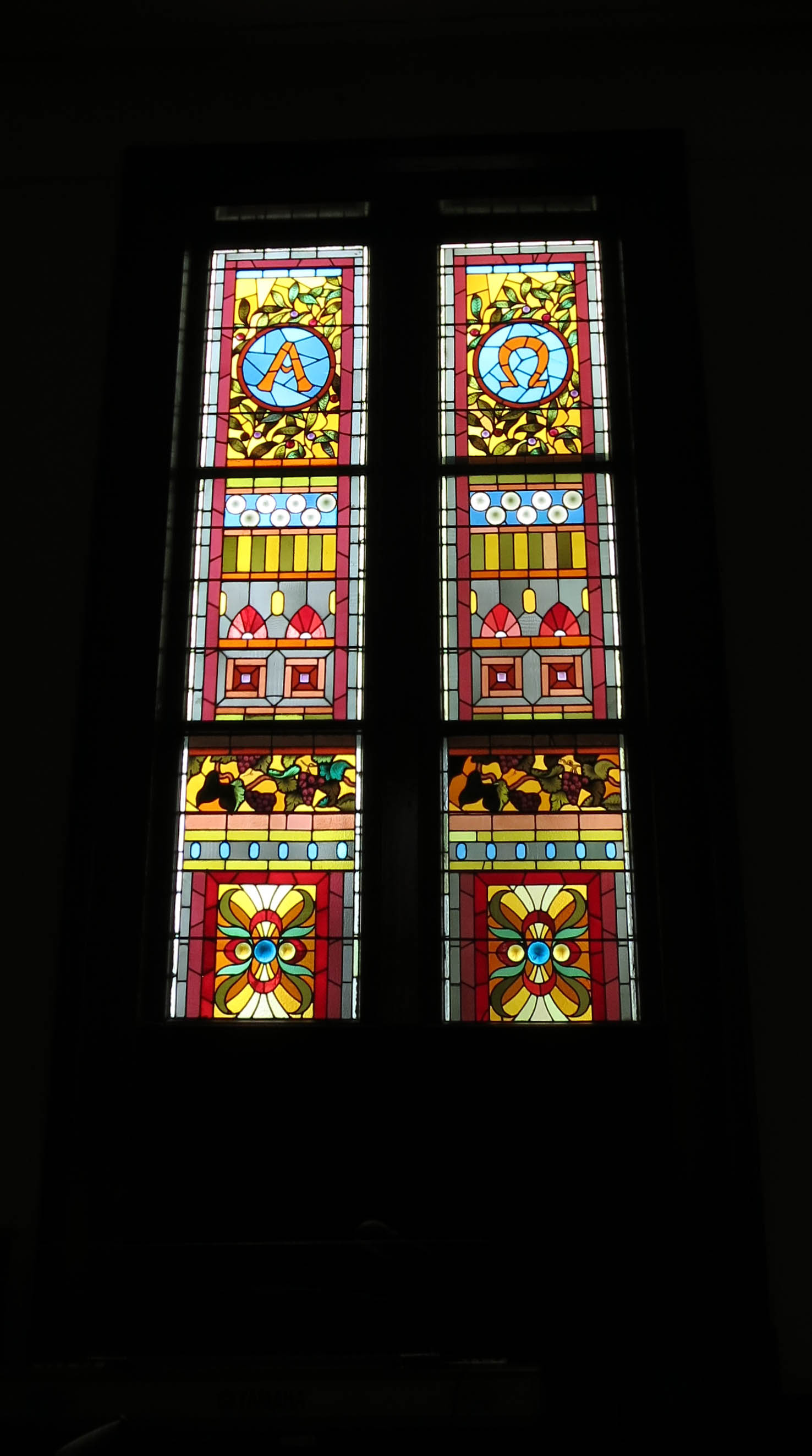 Stained glass window memorializing Deacon Henry Taylor who was called "Uncle Henry" and known for his love, kindness and faith. The window was given by his nephew James Calvin Taylor. Henry Taylor, was the grandson of Matthew and Janet Taylor (some of the early settlers of the town) . Like his brother James, Henry was a farmer in Derry; Henry died in 1865. The window includes the symbols, alpha and omega.